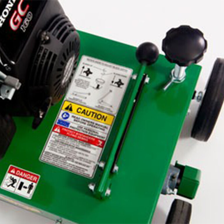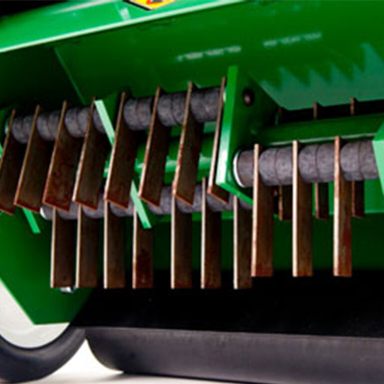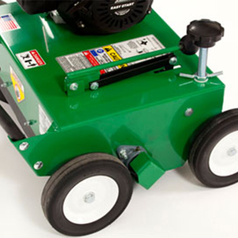 Billy Goat’s compact power rake maneuvers small properties effortlessly, removing matted thatch from turf in 20″ passes.