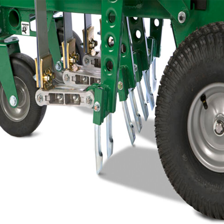 This aerator combines true 30″ wide aeration and speed up to 4.3 mph to complete a quarter of an acre in as little as 15 minutes! The AE1300H features Patent Pending variable aeration density (VAD) and creates 2-10 times more holes than drum models in one pass (8-48 hols per sq. ft.).