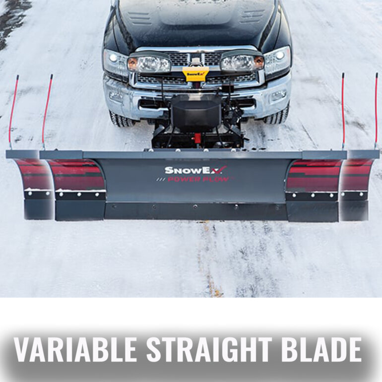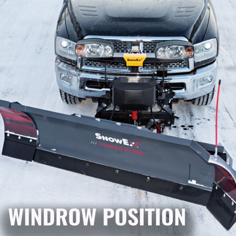 SnowEx adjustable-wing Power Plow offers the versatility to expand plow width by moving the wings outward (wide pass) or increase capacity by angling the wings forward (Bucket Blade) to match plowing conditions.