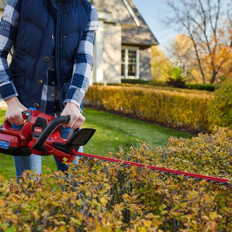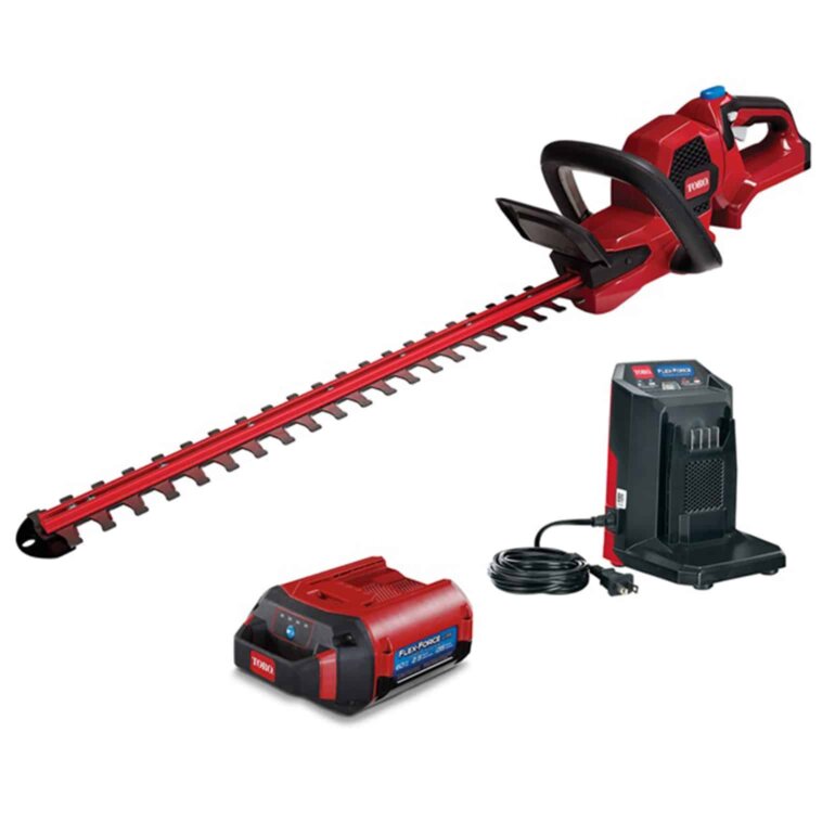 The Toro 60V* Max 24″ Hedge Trimmer is two full feet of ferocious. Its powerful 60 volt motor cuts through branches like butter. *Battery manufacturer rating – 60V maximum and 54V typical usage. Actual voltage varies with load.